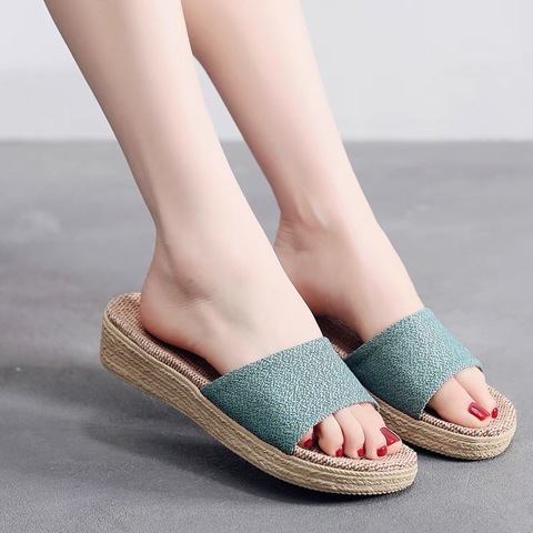 2024韓国版厚底リネン屋内スリッパ、夏用ハイヒールソフト滑り止めアウトソール付き